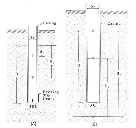 케이싱 내의 물을 퍼내거나 주수한 후의 시간별 수위 변화를 측정하여 투수계수를 산출하는데, 구경이 작은 케이싱을 사용하므로 공 내의 물을 퍼내기가 어려워 대개 케이싱 정부까지 주수한 후 수위변화를 측정합니다.